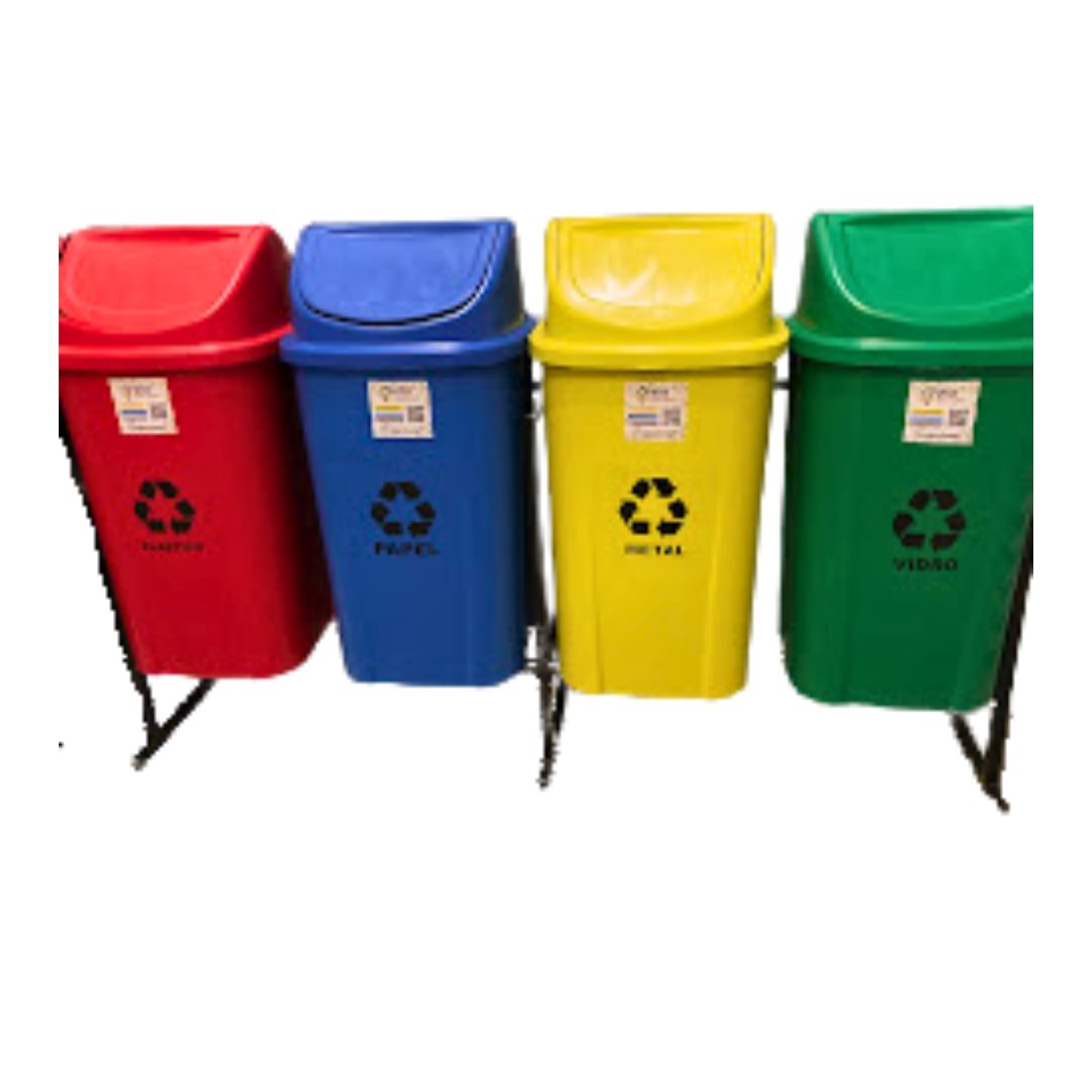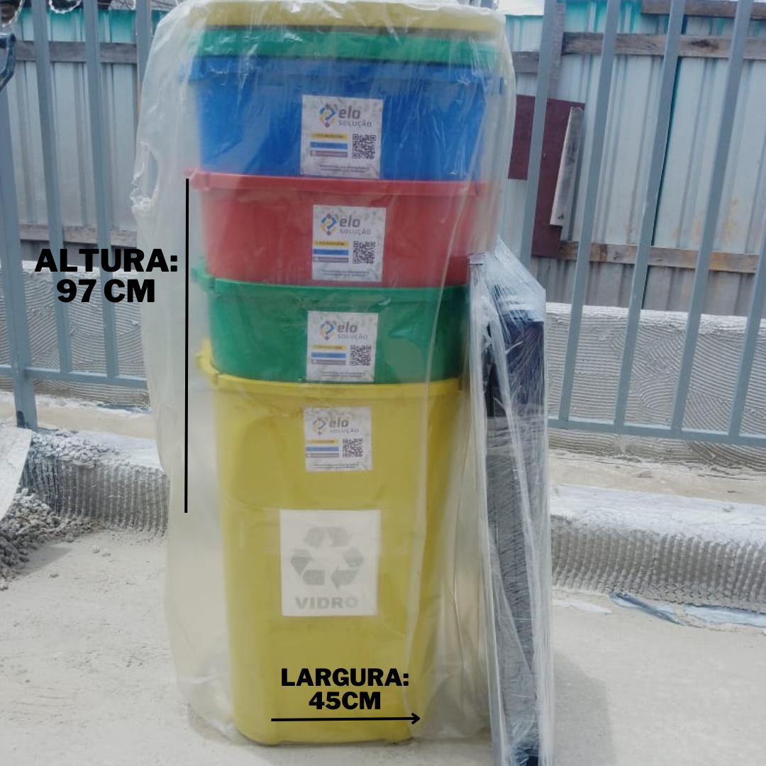 O kit é composto por 4 Lixeiras para Coleta Seletiva 60 Litros fabricado em Polietileno de Alta Densidade (PEAD) ou Polipropileno (PP).